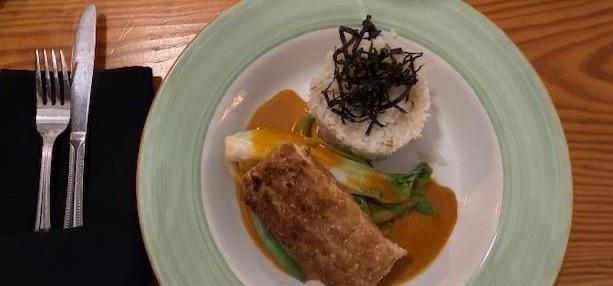 Choices are plentiful and inventive: in addition to a full sushi menu and bento boxes, mains include Gochujang (Korean chilli paste) chicken with plantain, breadfruit puree and kimchi; or, macadamia nut-crusted catch of the day with jasmine rice, wilted bok choy and a spicy coconut and ginger emulsion (pictured below). There’s also a solid range of vegetarian options.
